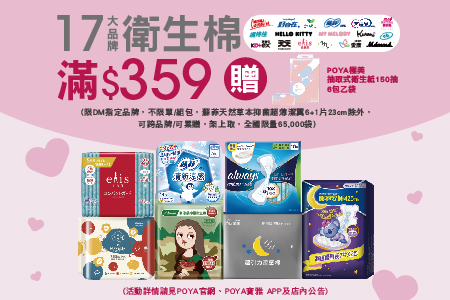 購買17大品牌衛生棉滿$359,贈POYA極美抽取式衛生紙(150抽/6包)乙包 (限DM指定品牌,架上取,可跨品牌,可累贈,不限單/組包,蘇菲天然草本抑菌超薄潔翼6+1片23cm除外,送完為止)參加品牌:康乃馨/好自在/蕾妮亞/蘇菲/來復易/大王elis/大王natura/靠得住/護得住/Mdmmd./愛康/歐碧/Hello Kitty/美樂蒂/酷洛米/天天/唯白