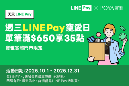 活動內容:活動期間內的每週三已註冊LINE Pay的用戶於寶雅實體獨立門市現場消費,結帳時透過LINE Pay條碼付款,且單筆交易實際支付金額滿新台幣600元(LINE POINTS及優惠券折抵金額不計入),可享以下優惠: