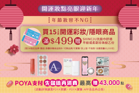15大品牌開運彩妝+隱眼商品滿$499,贈SHINE 2U洗臉巾乙包