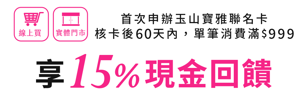 活動內容:首次申辦玉山寶雅聯名卡正卡且核卡成功,於核卡後 60 天內至寶雅全通路單筆消費滿 999 元 (含) 以上,享 15% 現金回饋 (每歸戶回饋上限 300 元)。