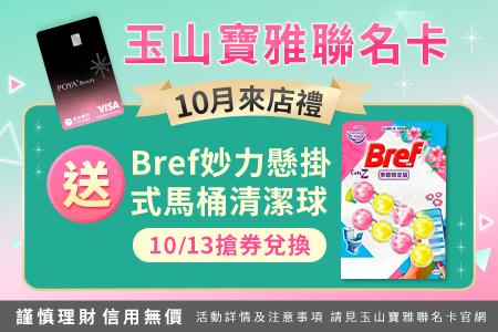 - 聯名卡限定_首刷禮:首次申辦玉山寶雅聯名卡正卡且核卡成功,於核卡後60天內於【門市】持寶雅聯名卡單筆消費滿$999享15%現金回饋(每月歸戶回饋上限$300);金卡會員加碼,贈寶雅即享券$300。
