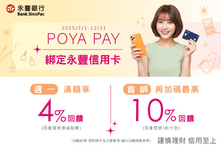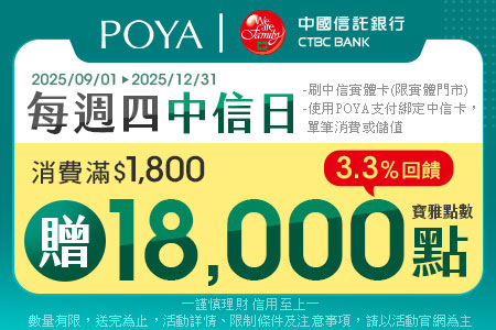 - 聯名卡限定_週間回饋:每週一到五於【門市】或【線上買】持寶雅聯名卡,綁定POYA支付單筆消費滿$888享13,500點點數回饋 (單筆限贈乙次,每卡每月限贈兩次)