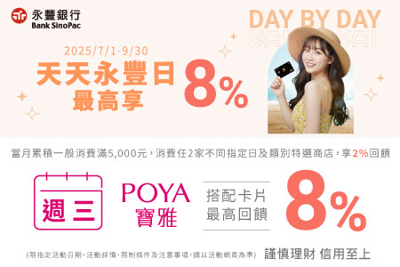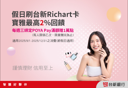 - 聯名卡限定_週末回饋:每週六、日於【門市】或【線上買】持寶雅聯名卡單筆消費滿$999享13%現金回饋(每月歸戶回饋上限$260)。