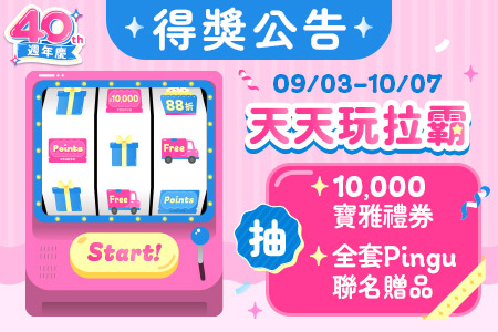 【得獎公告】歡慶寶雅40週年慶 天天拉霸抽萬元獎金