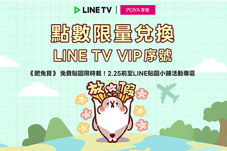 |活動內容:POYA寶雅點數現在也能看劇啦!為了擴大會員專屬權益,我們特邀LINE TV為合作夥伴。您的POYA寶雅點數就是追劇通行證!立即兌換 LINE TV VIP 序號,變漂亮後也能享受精彩不斷線的影劇人生!