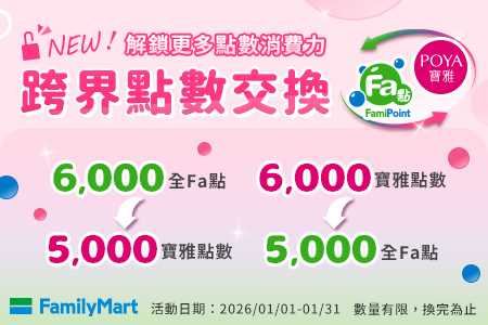 |活動內容:POYA寶雅點數快到期了嗎?現在有更便利的選擇!即日起,POYA點數正式開啟「全家FamiPoints」兌換通道!想喝美式咖啡、換超商零食、折抵帳單,或是想要享用更多全家會員專屬福利,通通一鍵搞定!
