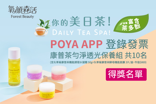 活動內容:買氧顏森活茶多酚系列商品任乙件(含保養品/茶葉系列面膜)至POYA APP登錄發票抽